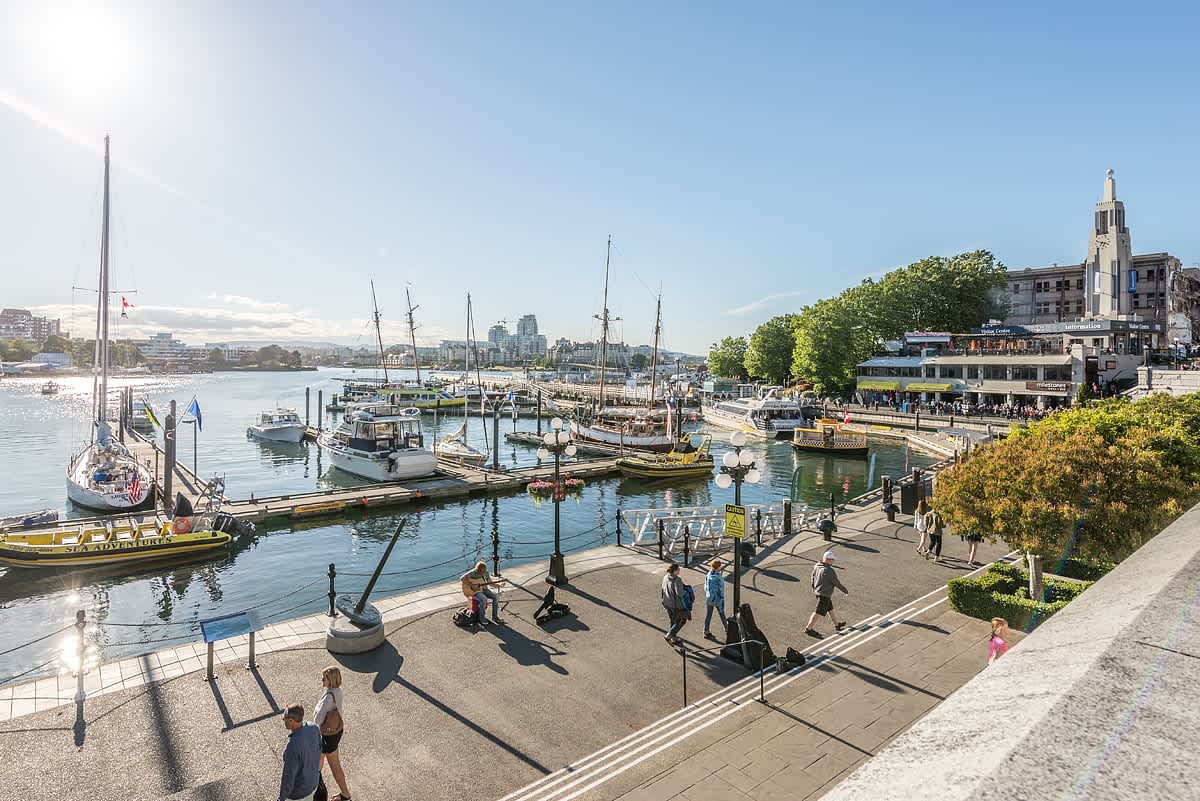 Paved waterfront walkway with bench seating along Wharf Street and lovely views of Victoria's working harbour.
